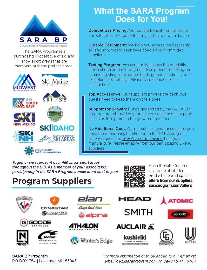 If you work for a ski or snow sports area as a rental or accessory buyer or manager, please contact us from your ski area email address to receive information on the program and how you can take advantage of our special supplier offers at: joe@saraprogram.com